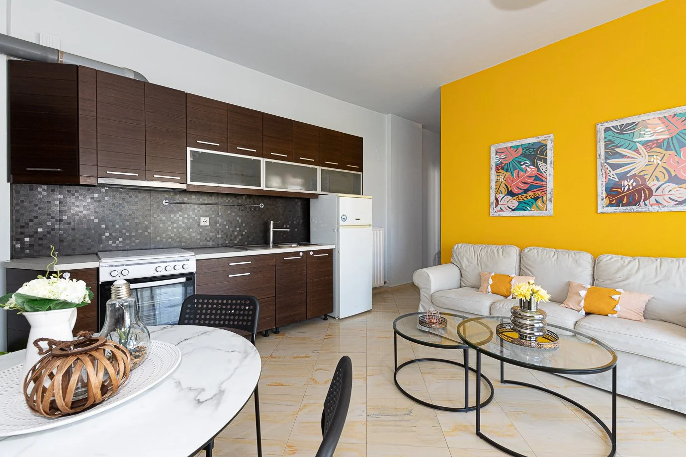 It is a cozy and fully equipped apartment. It consists of a bright , colorful living room which is carefully decorated with vivid summertime colors , that will lighten up your days and vacation mood . In the living room there is also the kitchen and a fireplace that can be a great plus for those visiting us during the winter time . Furthermore , the apartment has one bathroom and a spacious relaxing bedroom . Also there is one balcony where you can relax enjoying the beautiful sea view during the sunset , combined with the stunning view of the historical mountain of Stroumpoulas.